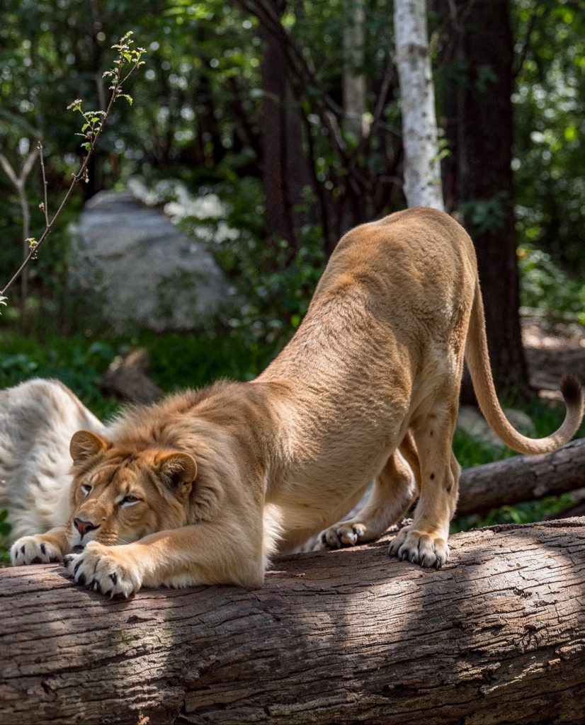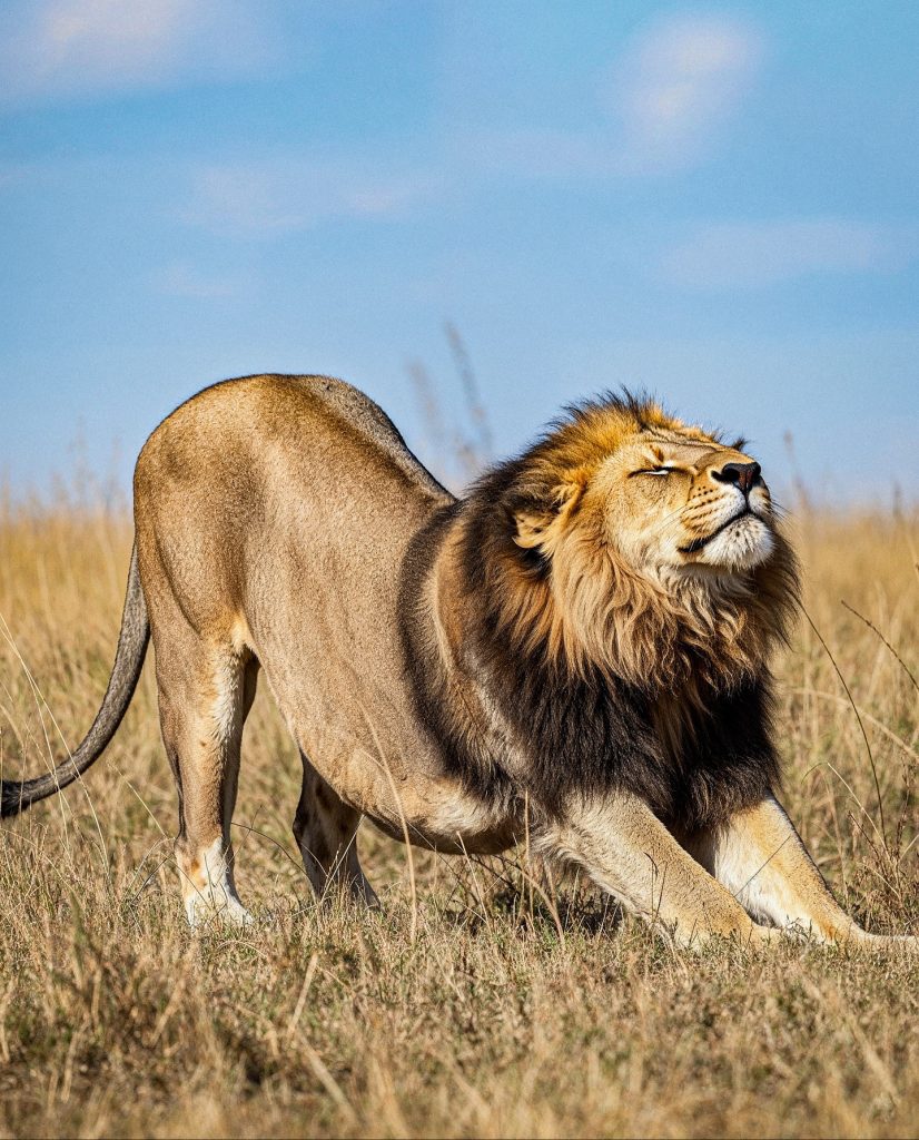 There’s something beautifully humbling about this. People often think of lions and tigers as these ferocious, untouchable creatures, but when you catch them stretching in the wild, you suddenly see the house cat in them. The way they close their eyes, press their paws forward, and tilt their heads looks almost identical to what your pet does after waking from an afternoon nap. It’s a reminder that, despite the worlds that separate them, all cats carry the same heritage in their bones.