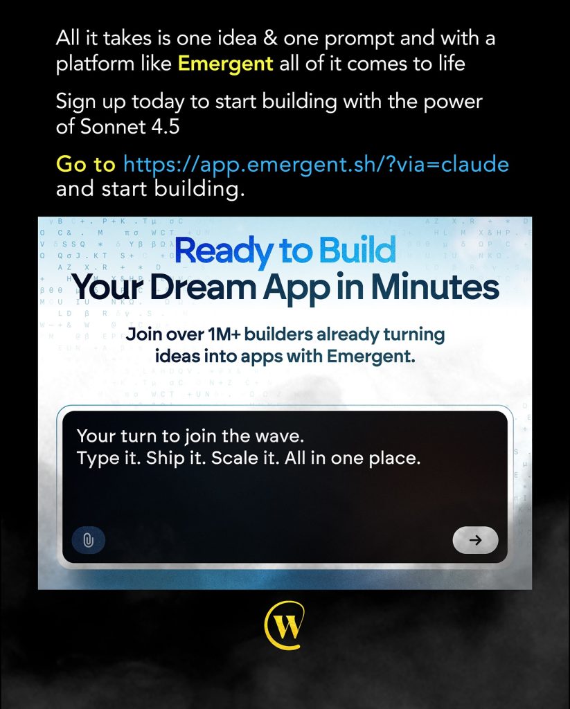 The message is clear: all it takes is one idea and one prompt. Emergent, powered by Claude Sonnet 4.5, is transforming app development from a gatekept skill into something universally accessible. Over a million people are already building apps, but what excites me is thinking about the millions more who will soon join.