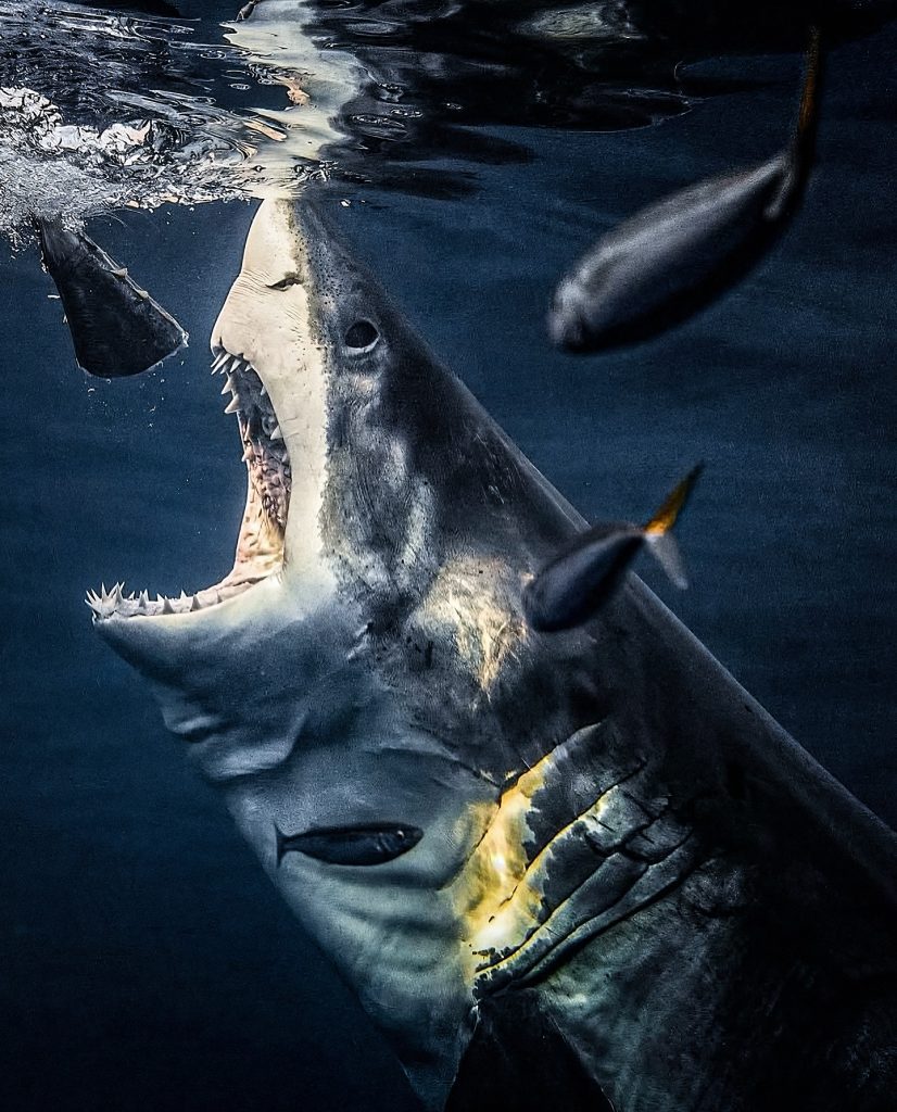 Known for his breathtaking close-ups of great white sharks, Rannachan’s work goes far beyond thrill-seeking. His images capture an animal that’s both terrifying and misunderstood — a reminder that the great white is not a monster, but a masterpiece of evolution. Shot from the deep waters of Mexico’s Guadalupe Island, his photos often show sharks with their jaws open, eyes black as the ocean, and teeth glinting through the water — an image so powerful it seems almost unreal. Yet every frame is authentic, shot by a man who has made peace with fear in order to reveal the truth about these creatures.