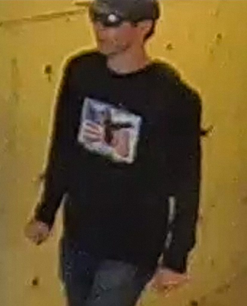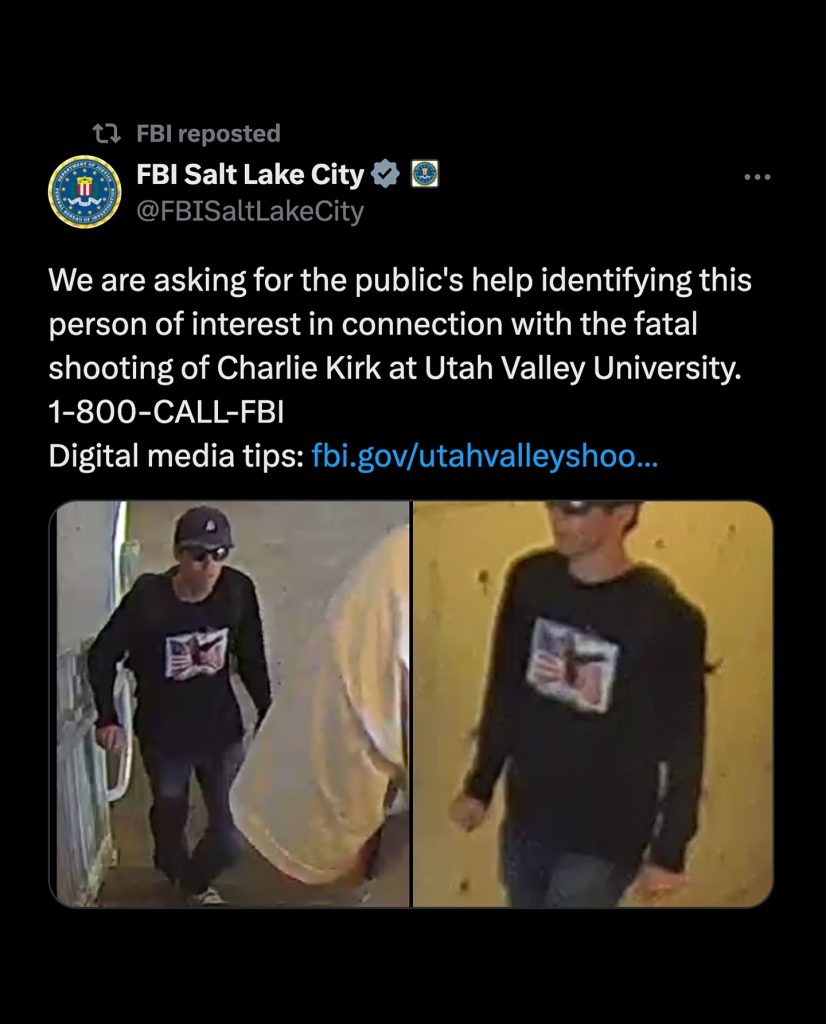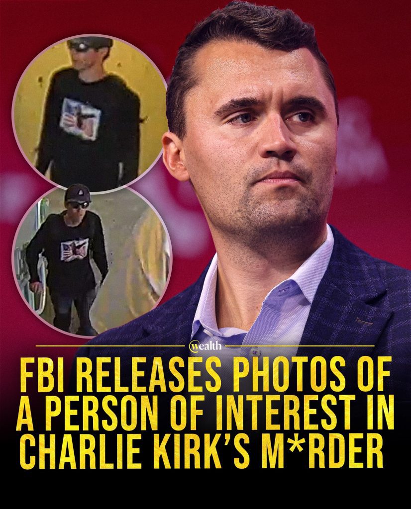 The investigation into the tragic death of conservative activist Charlie Kirk has reached a new chapter. The FBI has officially released images of a person of interest they believe may be connected to the case. The photos show a man dressed in black clothing, wearing a cap and sunglasses, moving through what appears to be a building hallway. His face is partially obscured, but the details of his outfit are striking: a dark long-sleeve shirt with a distinctive graphic design on the front.