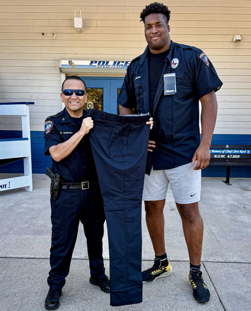 News of Jordan’s role spread quickly, and the photos of him alongside his fellow officers have become an internet sensation. Standing head and shoulders above seasoned officers, Jordan looks like a figure out of a movie. The image of his colleague holding up his massive pants drew laughs online, but also admiration. People see in Jordan not just a novelty, but a sign of what dedication looks like when paired with uniqueness. Kemah residents, in particular, have welcomed him warmly. They see someone who wants to be part of their safety and well-being, someone whose physical stature might deter trouble but whose heart clearly lies in helping others. For children in the community, he’s already become an unforgettable role model—someone who shows that you don’t have to fit into a mold to make an impact.