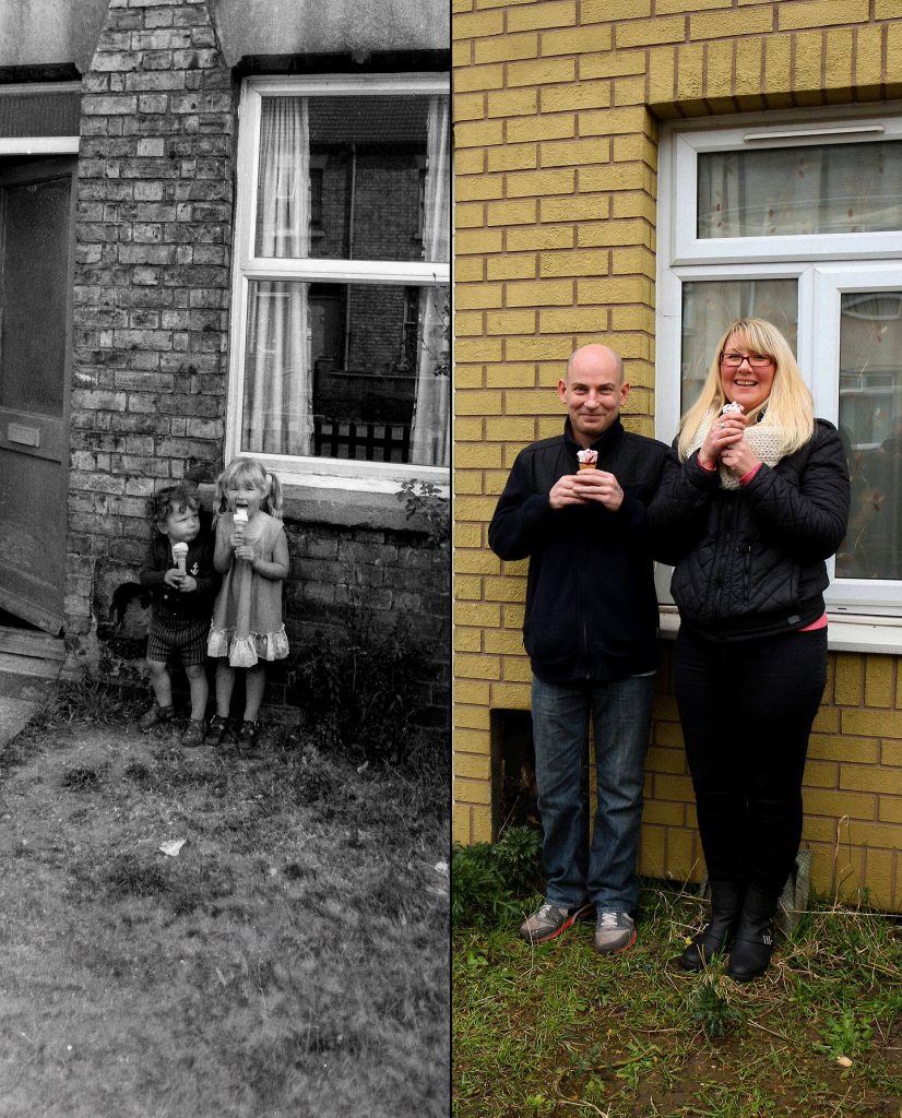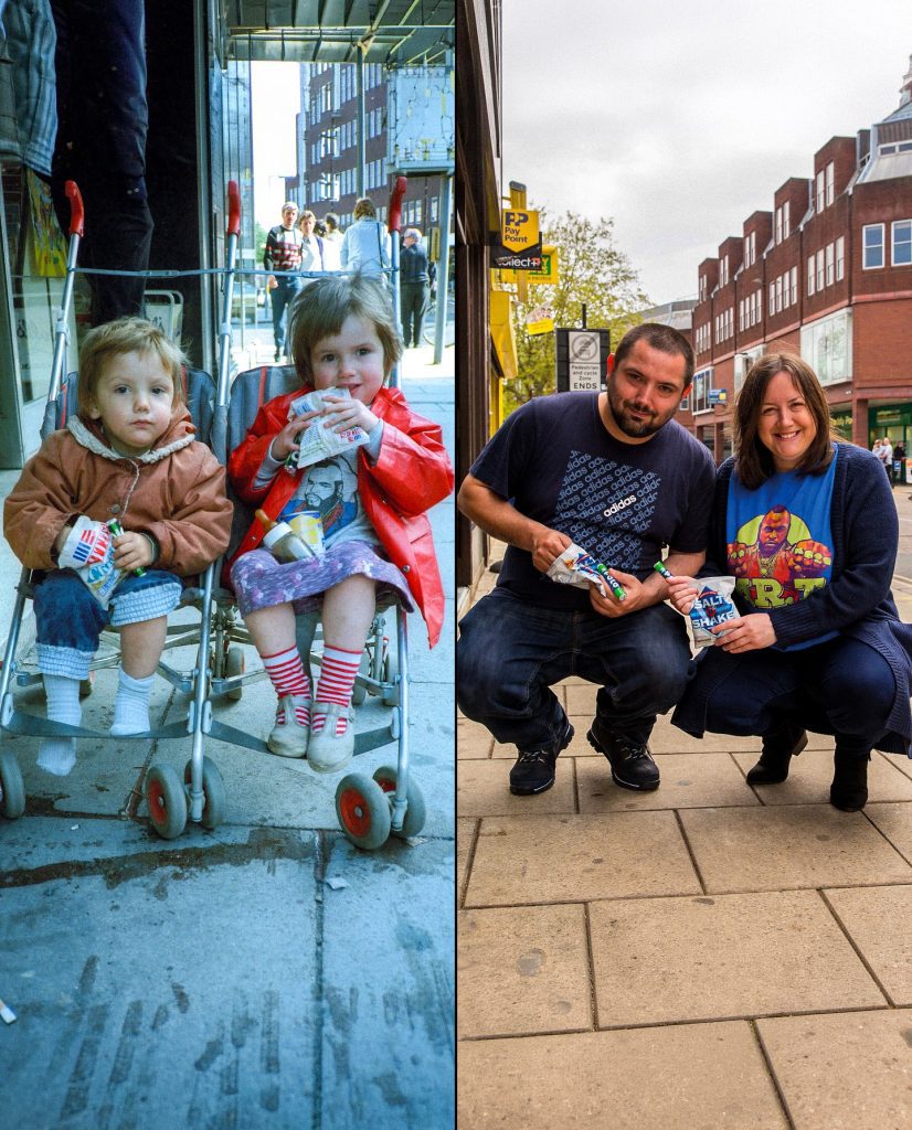 The contrast in these portraits — a young boy now standing as a grown man in the same doorway, two teenage friends now reunited with families of their own — goes beyond photography. It’s about human connection and the story of how moments that once felt ordinary become priceless when revisited years later.
