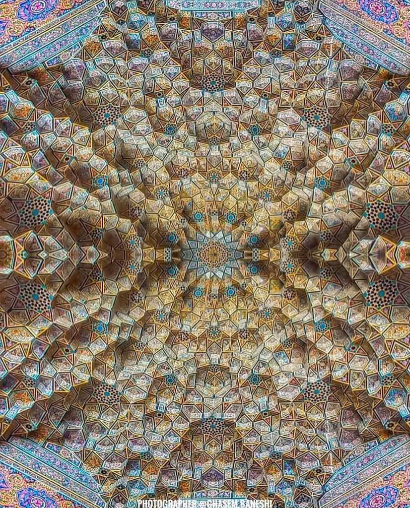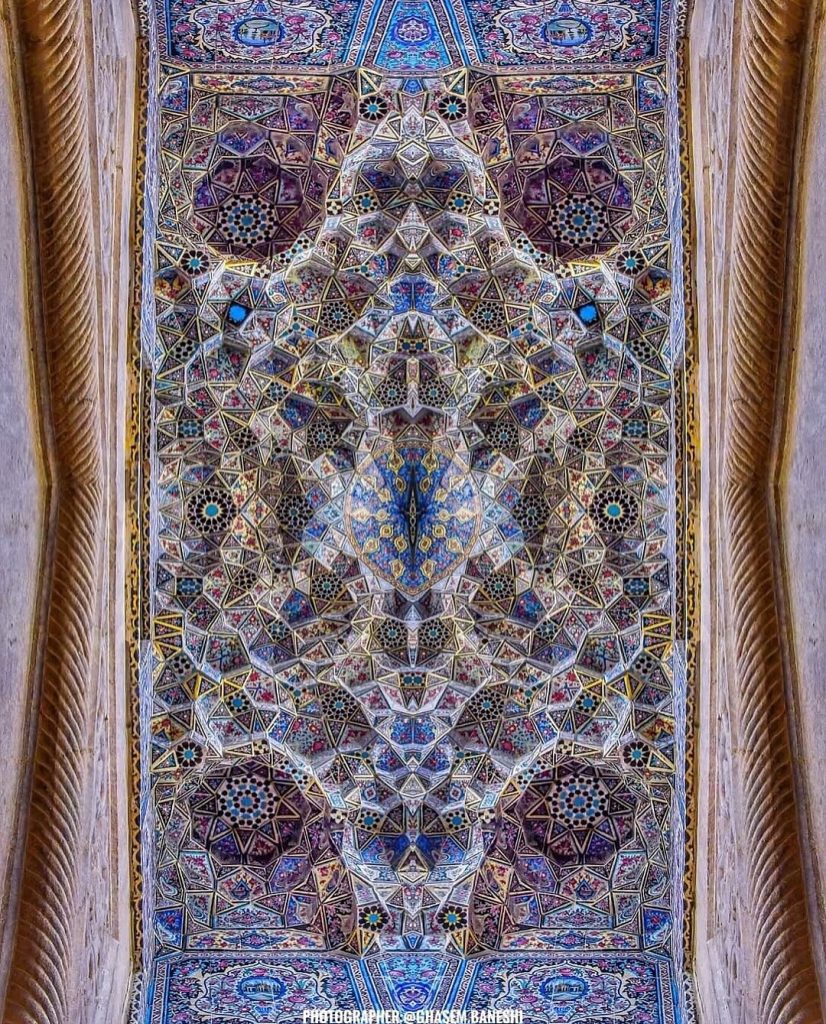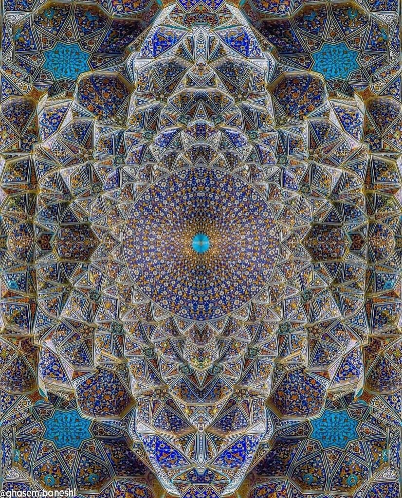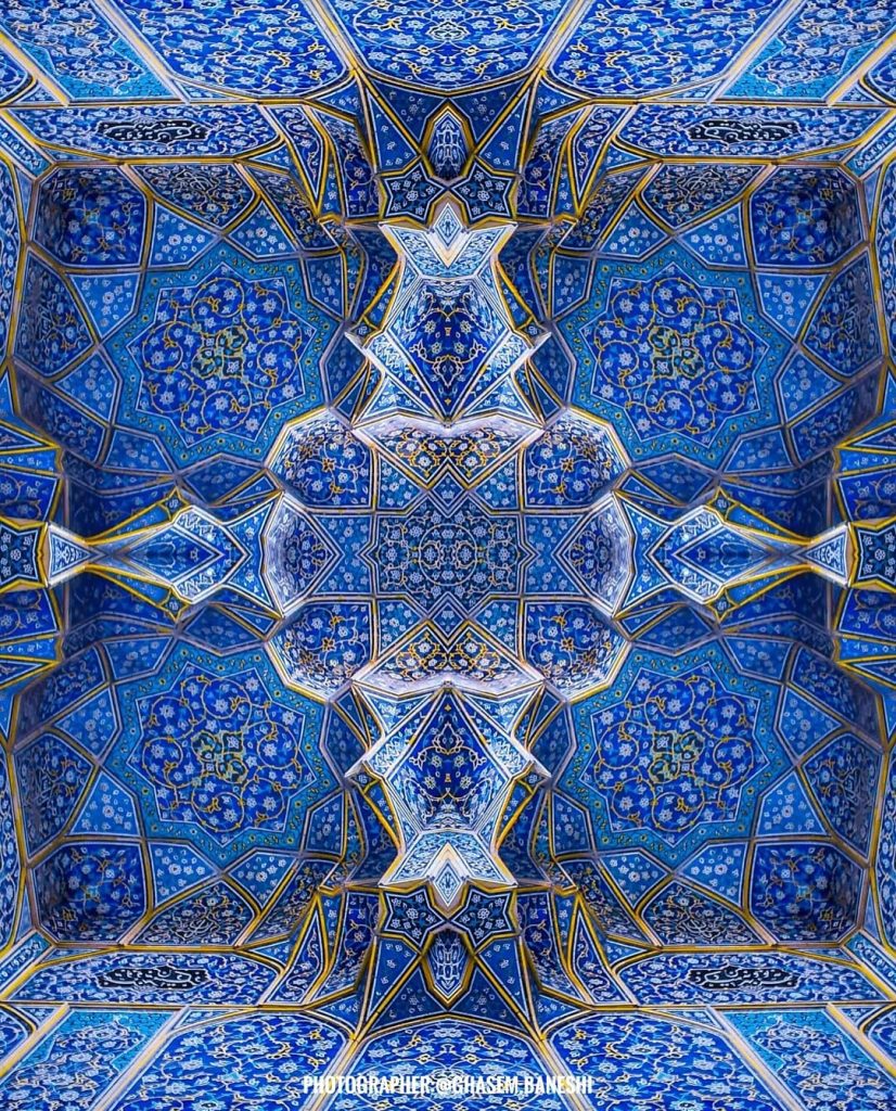 In Baneshi’s images, sunlight filters through colored glass windows, bouncing softly off thousands of glazed tiles. The result is a kaleidoscope of color that feels alive — a living geometry that shifts as the day moves. There’s an almost divine balance to it, as if these ceilings were built not just for prayer, but to make people look up in awe.