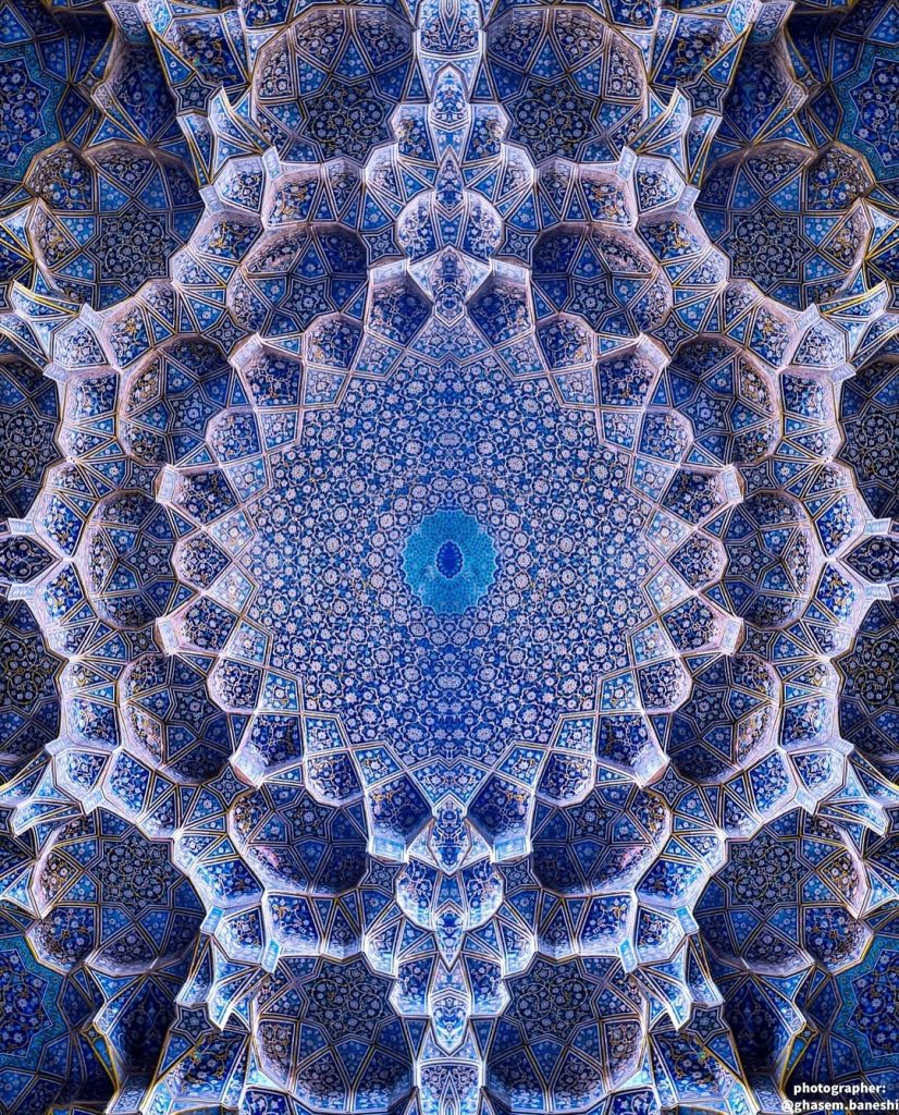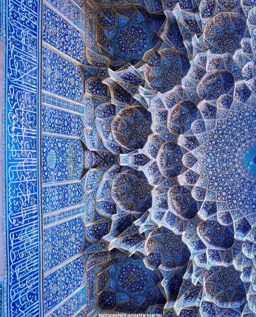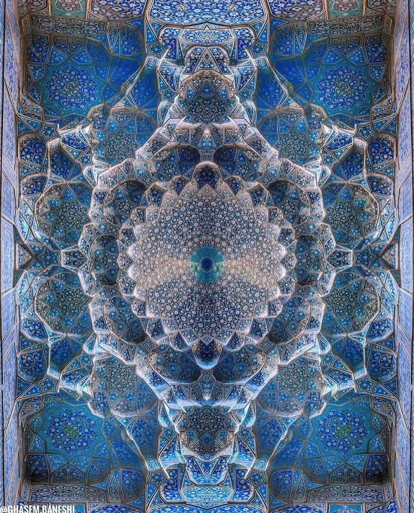 The photos are mesmerizing: infinite shades of blue and turquoise arranged in patterns so mathematically perfect, they feel otherworldly. Each ceiling looks like it was built by both a mathematician and a poet — someone who understood geometry as a spiritual language. These designs, called muqarnas, date back to the 11th century and have been refined over generations of Persian craftsmen. The shapes form a cascade of miniature domes, arches, and niches that seem to pull light down from the heavens.