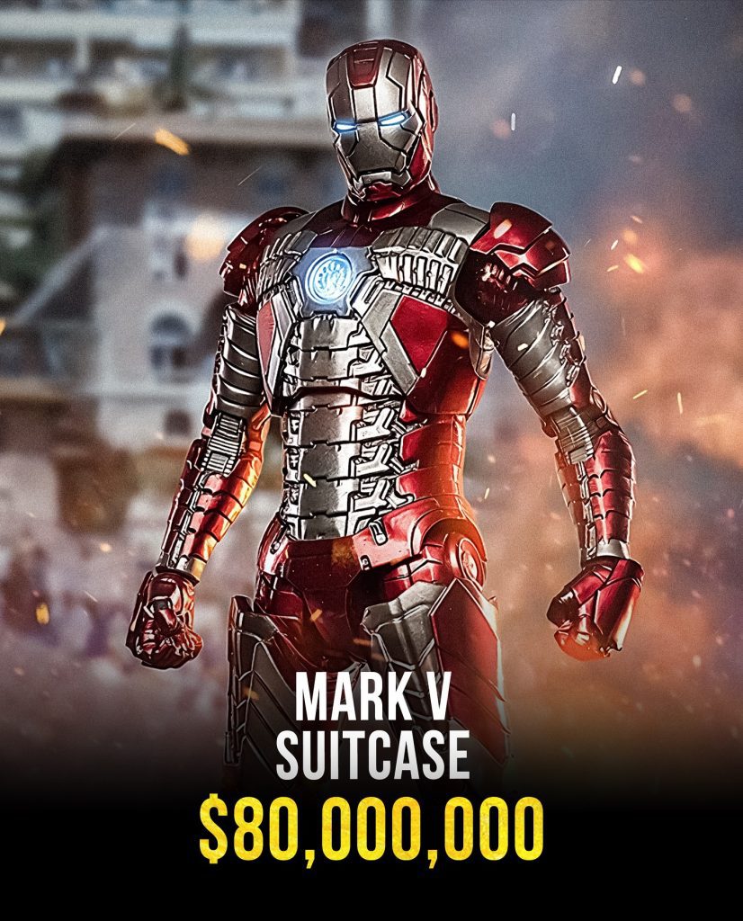 The Mark V made Iron Man personal — literally portable. It folded neatly into a briefcase and could be deployed in seconds, something Stark famously demonstrated on the Monaco racetrack. Priced at $80 million, it was a balance between convenience and combat power. This suit proved that Iron Man wasn’t just a machine; he was an idea — always ready, always evolving.
