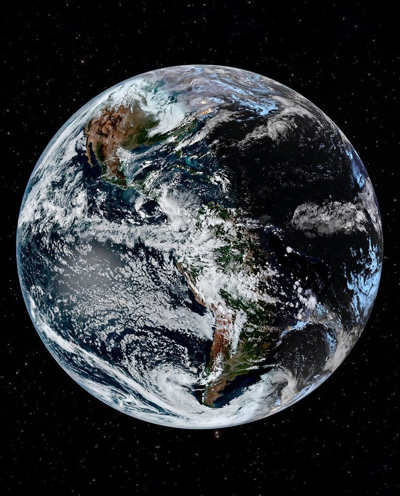 Every ten minutes, this satellite — part of NOAA’s Geostationary Operational Environmental Satellites series — sends back a complete “full-disk” image of the planet. These are not mere photographs in the traditional sense. They are a synthesis of visible-light data and infrared readings, processed through a technology known as GeoColor. This allows the satellite to create a composite that appears vividly realistic both during the day and at night, by merging real-time weather data with a static city-lights map captured by other instruments. The result is an image that shows Earth not as a still object, but as a living, breathing system — in motion, in balance, and perpetually illuminated by both sunlight and human light.