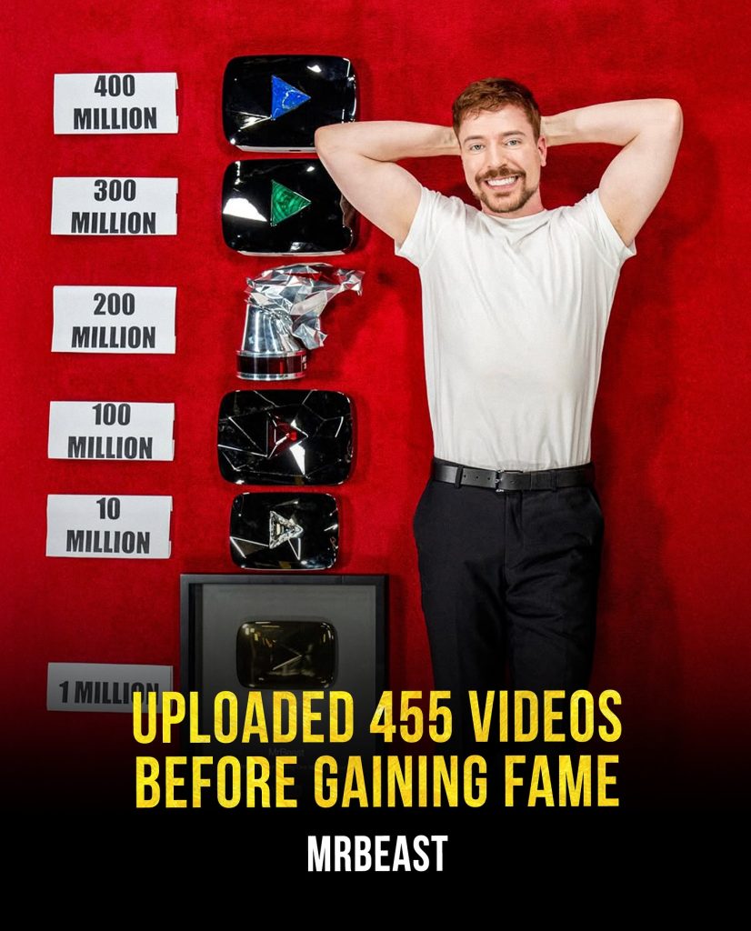Jimmy Donaldson, better known as MrBeast, is the face of YouTube’s new era, but his rise was anything but instant. Long before he was giving away millions of dollars in challenges and building a digital empire, he was just a teenager uploading video after video to almost no audience. In fact, it took him 455 uploads before the internet really began to notice. That kind of persistence is hard to even imagine. Every upload felt like a gamble with no payoff, but Jimmy treated each one as practice, as a lesson. He studied algorithms, tested formats, and learned how to keep people watching. Today, with over 200 million subscribers and countless viral projects, MrBeast’s story reminds us that success is rarely sudden—it’s built on years of unseen work.